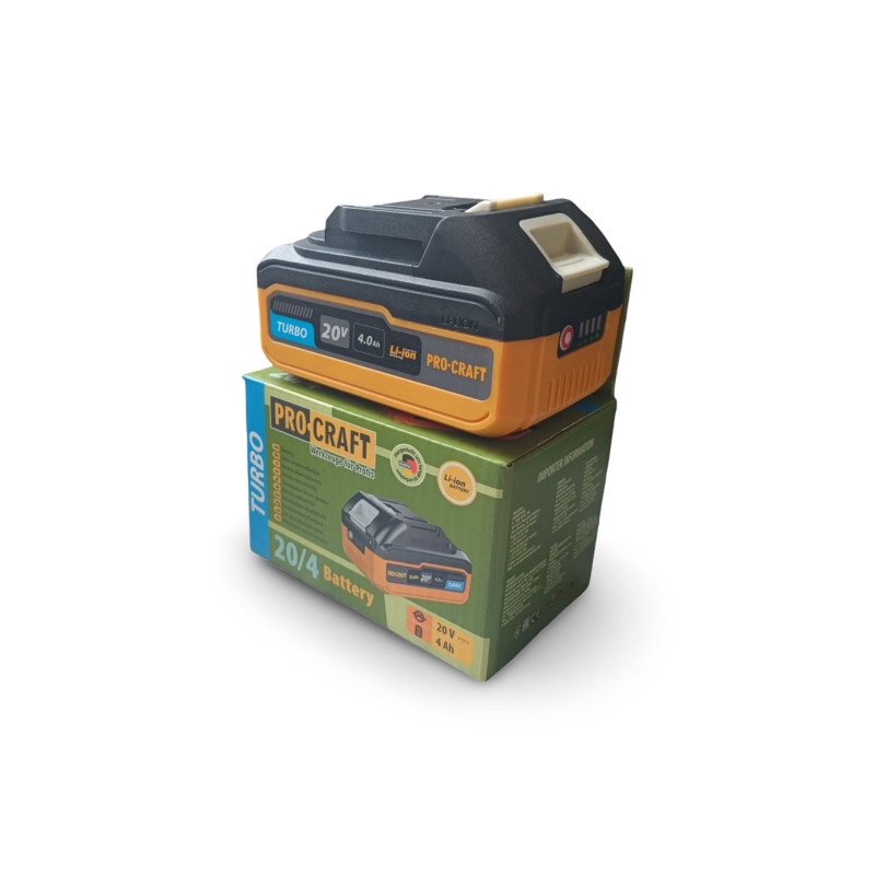 Procraft 20/4 TURBO — це високоякісна акумуляторна батарея з ємністю 4 А·год, яка забезпечить стабільну роботу вашого електроінструмента. Вона створена на основі сучасної технології Li-Ion і вирізняється довговічністю, ефективністю і зручністю використання.